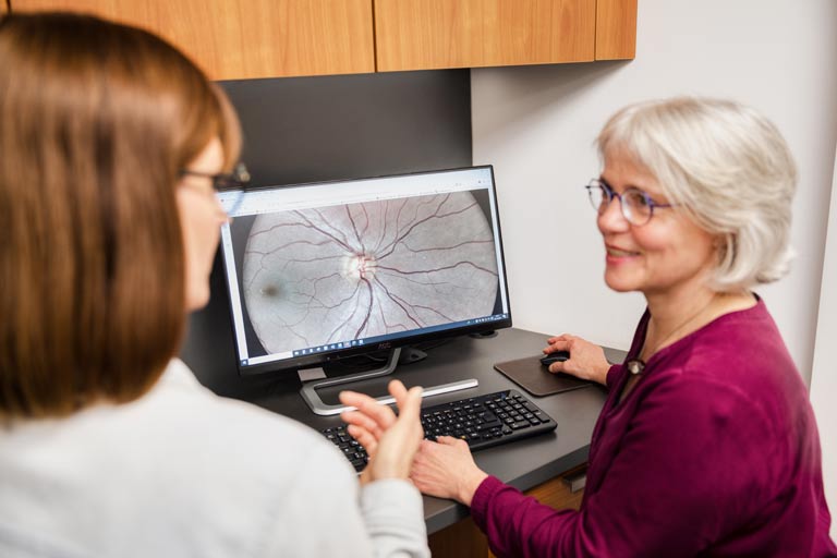 Im vierten Schritt erläutern Ihnen unsere Fachleute für gutes Sehen die KI-basierte Auswertung Ihres persönlichen Netzhaut-Screenings und der Ergebnisse Ihrer Augenvorsorge.